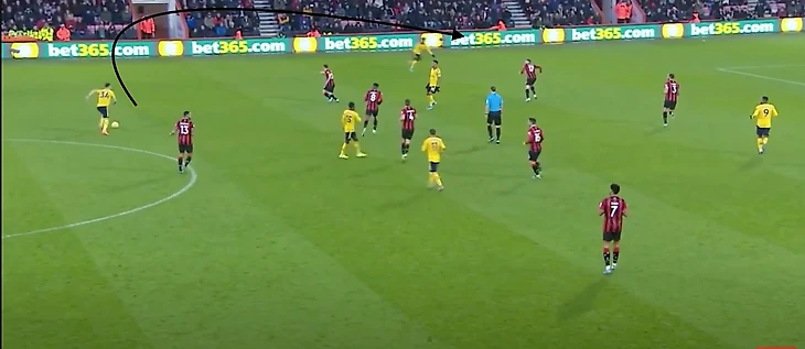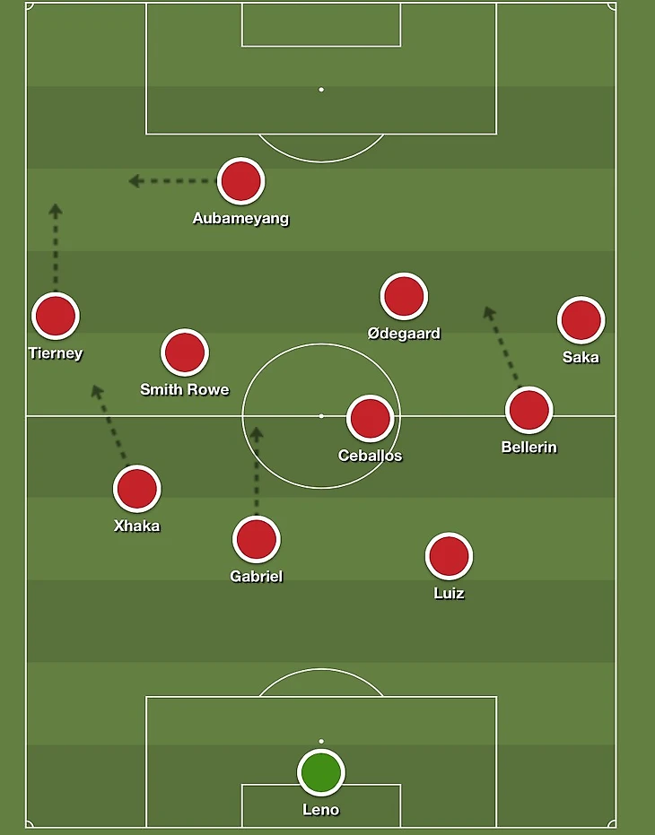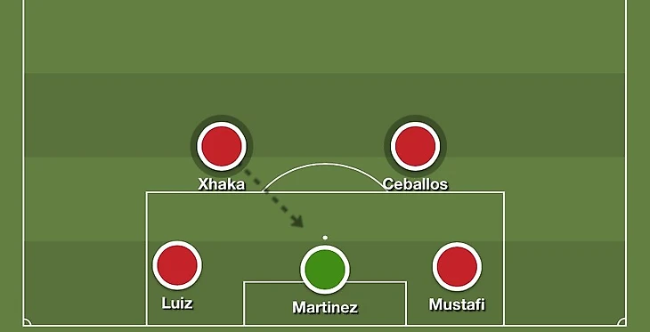 За счёт того, что Джака опускается назад, Килиан Тирни может создавать ширину, поскольку он способен перемещаться высоко и широко, оттесняя фулбэков соперника и создавая креативное пространство. Смит Роу оттягивает соперника опускаясь между линий, чтобы создать свободные зоны для паса Джаки на Тирни.