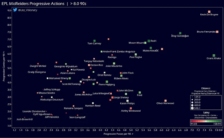 В итоге, учитывая все эти моменты, Джака занимает второе место в лиге по показателю progressive passing, уступая только Фернандесу, что и показано на графике ниже. Это также развенчивает миф о том, что Джака ориентирован на горизонтальные передачи и пасы назад, поскольку в реальности всё происходит в точности наоборот.