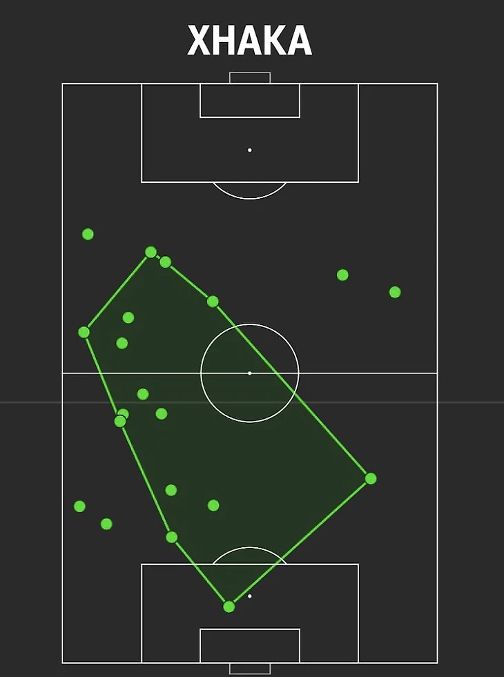 Одна из причин, по которой Джака играет так часто – это динамика, которую он добавляет в игру команды. Графика ниже демонстрирует участок поля, который Джака контролировал за счёт своих оборонительных действий в матче против "Лестера", и выглядит он крайне впечатляюще. Это иллюстрирует способность Джаки покрывать большую часть поля, несмотря на то, что физически он перемещается относительно немного.