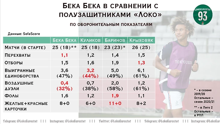 По оборонительным метрикам в сезоне-2020/21 Бека-Бека ближе к Даниилу Куликову, чем к Крыховяку. А по некоторым показателям даже проигрывает россиянину. Хотя мы анализируем первый полноценный сезон француза во взрослом футболе (и очень разные лиги), и он моложе Даниила на три года.