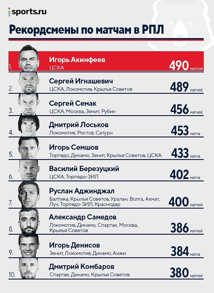 Теперь капитан ЦСКА – рекордсмен чемпионатов России по проведенным матчам. Сегодняшний стал для вратаря 490-м, Акинфеев обошел бывшего одноклубника Сергея Игнашевича (489 игр).