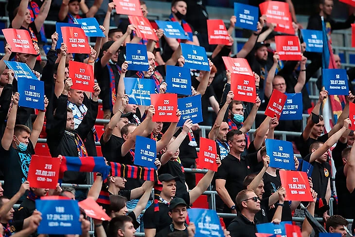 Болельщики ЦСКА на матче с «Ахматом» устроили перформанс – разложили 490 табличек со всеми матчами Акинфеева в чемпионате России.