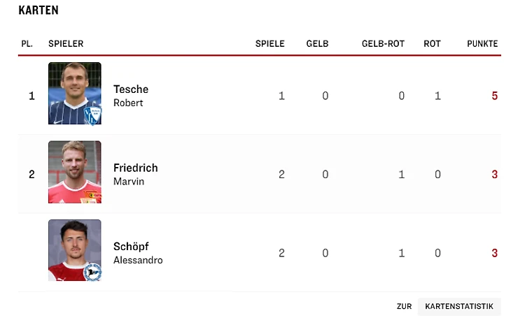 *игрок – кол-во игр – желтые – 1+1 желтые – красные – всего