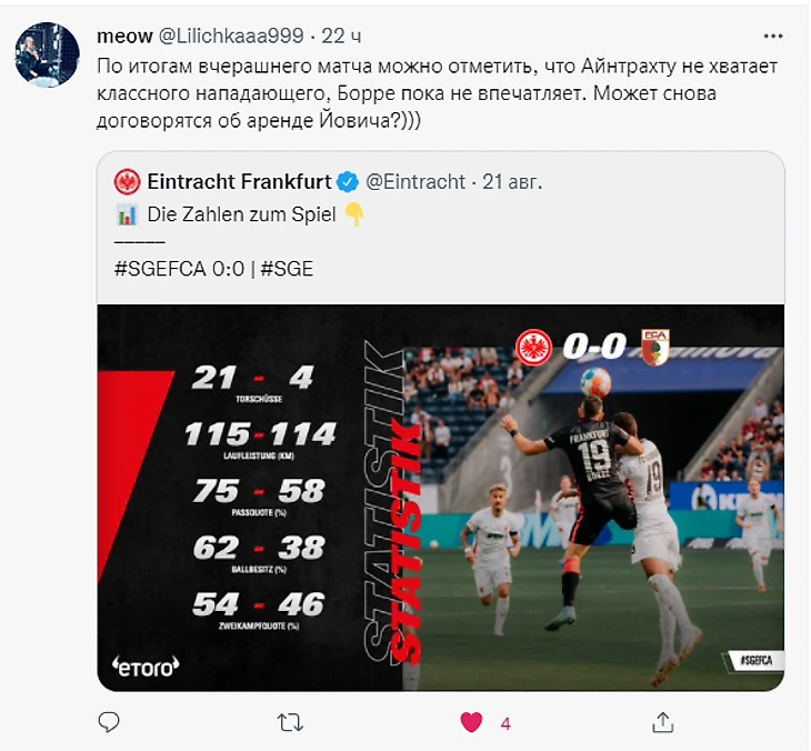 «Айнтрахт» окончил матч со значением в 60% в графе «владение мячом» и почти в два раза большим числом сыгранных пасов за матч, но забить «орлам» так и не удалось.