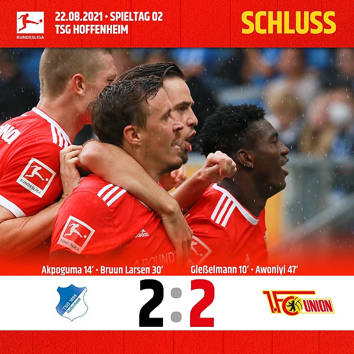 Поделили очки во втором туре «Хоффенхайм» с «Унионом», устроив лютую перестрелку на “Презеро Арене”. Уже на старте матча соперников было не остановить: гости повели уже на десятой минуте – Гиссельманн довольно неожиданно и молниеносно оказался в штрафной и открыл счет, оказавшись первым на добивании. Вскоре счет был уравнен – Акпогума предусмотрительно остался в штрафной после стандарта и уверенно пробил головой.