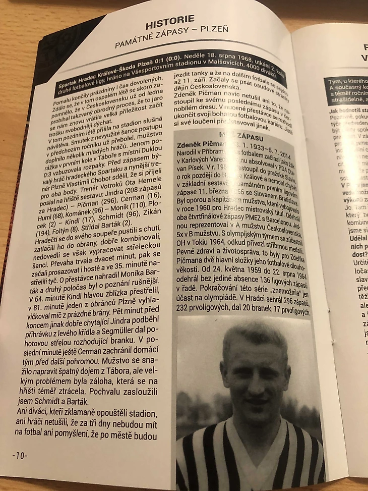 Попалась и программка. Из интересного - все страницы выполнены в черно-белых цветах клуба (кроме рекламы, естественно). Есть занимательный исторический раздел, в котором описывается какой-нибудь из матчей с нынешним соперником. На этот раз речь шла о матче 1968 года. Тут же и краткая биография игрока матча - им в тот день стал игрок Градца Зденек Пичман (1933-2014), серебряный призер Олимпиады-1964 в Токио в составе сборной Чехословакии.