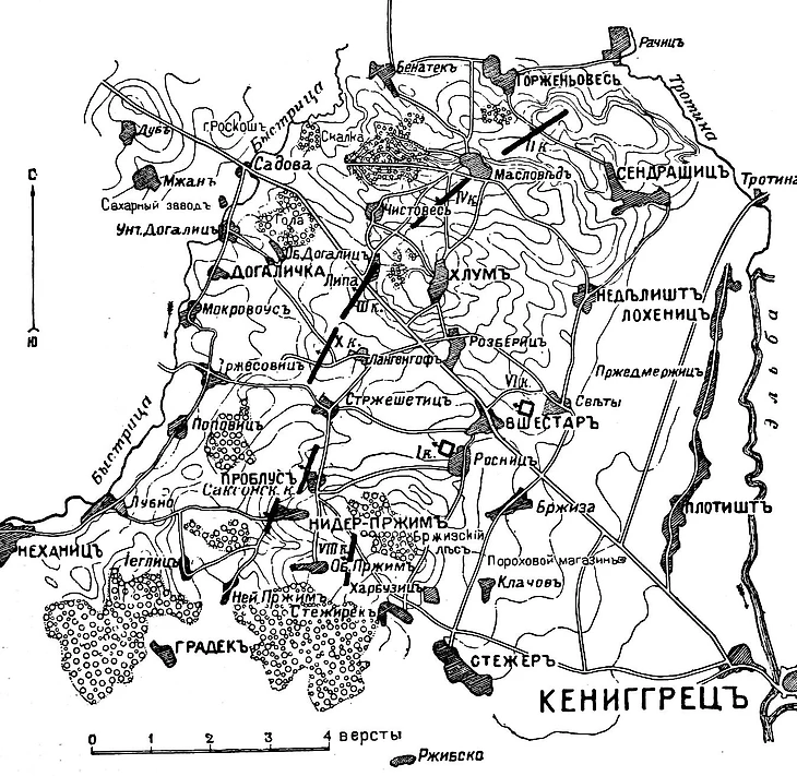 Кстати, в Военной энциклопедии Сытина начала прошлого века Градец-Кралове указан как Кениггрец— так его называли немцы. Причём занятно, что в немецком языке название города исказило смысл: из "городка королевы" он превратился в "городок короля".