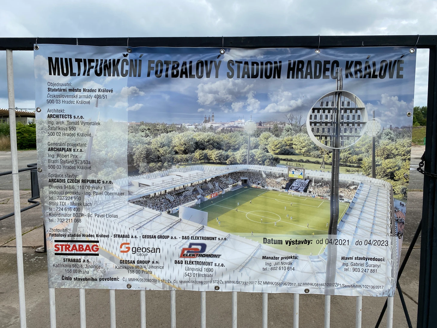 Стадион, который вы видите на фотографиях, был окончательно открыт в 1966 году, хотя матчи на нем стали проводить еще в начале шестидесятых. К торжественному открытию был приурочен товарищеский матч с бразильским "Васко-да-Гама" (2:3) — на той игре присутствовало аж 20 тысяч болельщиков! На момент закрытия на последнюю реконструкцию, к слову, арена насчитывала всего 4500 сидячих мест. Стадион и вправду был по тем временам огромный. Игроки жаловались, что на предыдущей арене (с деревянной трибуной на 500 мест) было гораздо лучше слышно каждого болельщика в отдельности (а некоторые даже рассказывали в интервью, что были сверхмотивированы играть хорошо, опасаясь разозлить отдельных фанатов). Поэтому "Градец" на некоторое время переехал обратно и лишь изредка поигрывал на "аэродроме", как многие прозвали "гигантских" размеров новую арену. Случалось даже так, что команда переодевалась в помещениях старого стадиона, а играть шла на новую арену!