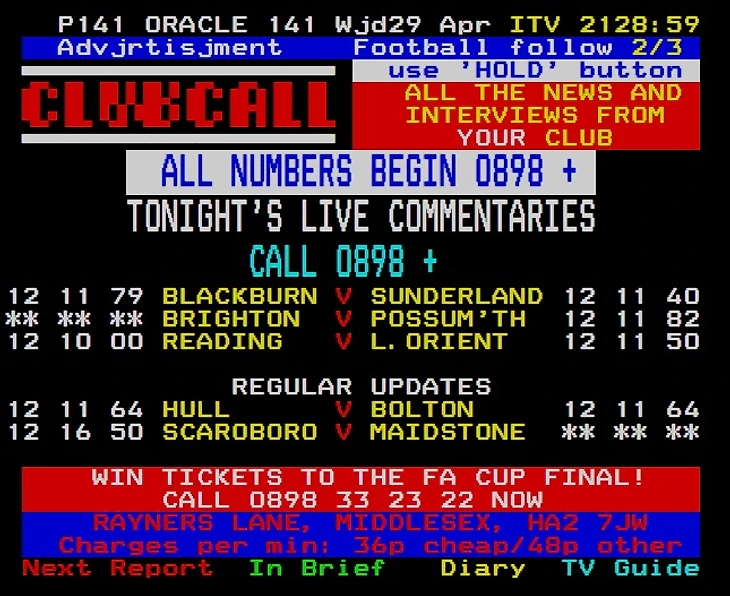 *Clubcall – что-то вроде радио станции, запущенной в 1986 году в Британии, с тематическими каналами, посвященными футбольным клубам. Болельщик мог просто набрать нужный номер со стационарного телефона и получить доступ к трансляциям футбольных матчей, интервью, новостям его любимой команды в аудио формате. Удовольствие было не из дешевых – в среднем минута звонка стоила от 25 до 48 пенсов в минуту. Стоимость прослушивания полного футбольного матча могла составить до 35 фунтов стерлингов. Тем не менее недостатка в желающих не было. Так, например, к концу сезона 1987/88 в Clubcall было совершено 12 миллионов звонков.