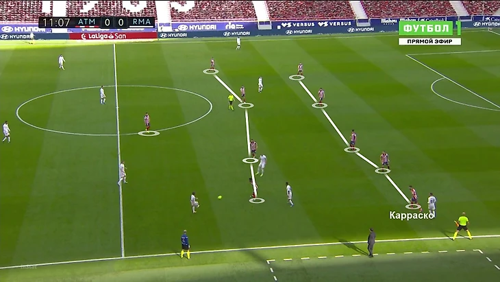 Чаще всего, его «Атлетико» — это компактные 4-4-2, представляющие собой низкий оборонительный блок в сочетании со скоростными контратаками. При этом «матрасники» не всегда играют в глухую оборону временами они контролируют темп матчей, владея мячом в течении длительных периодов времени. Четверке защитников обычно помогает дополнительный блок, состоящий из четверых игроков полузащиты. Сохранение концентрации даже при затяжных атаках соперника — вот что выгодно отличает футболистов «Атлетико». Команда Симеоне знает, как эффективно использовать переходные фазы игры. Футболисты моментально перестраиваются из среднего или низкого оборонительного блока на атакующую конфигурацию, когда соперник теряет мяч. Показательны перемещения крайних защитников: если «Атлетико» долго владеет мячом, они поднимаются очень высоко. Так обеспечивается ширина атаки, а еще создаются ситуации для использования кроссов. Это сильная сторона «матрасников», учитывая наличие в команде нападающих, способных замкнуть такие передачи.