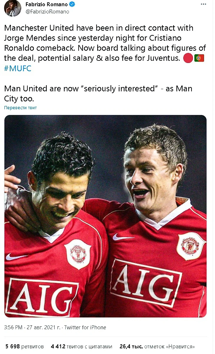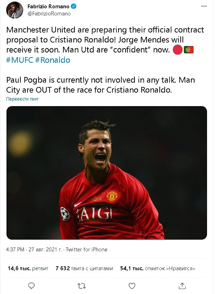 "Жорже Мендеш только что получил официальное предложение контракта от «Манчестер Юнайтед» для Криштиану Роналду. Возвращение более чем близко - сейчас на «финальной стадии». Криштиану хочет снова присоединиться к «Манчестер Юнайтед». Он готов принять контракт как можно скорее."