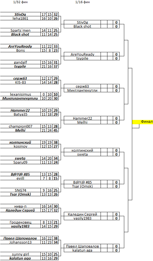 Самое долгое выяснение, кто же пройдет дальше, пришлось делать в паре Sparts′men-Black Shot - ни по количеству счетов (у обоих по нулю за оба тура), ни по количеству разниц (по 2 угаданных разницы) не получилось выявить победителя. Помогли исходы - 3 у Black Shot′а против всего 2 у соперника дали путь в 1/16 финала.