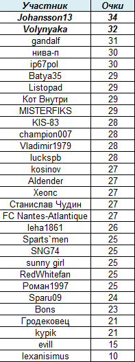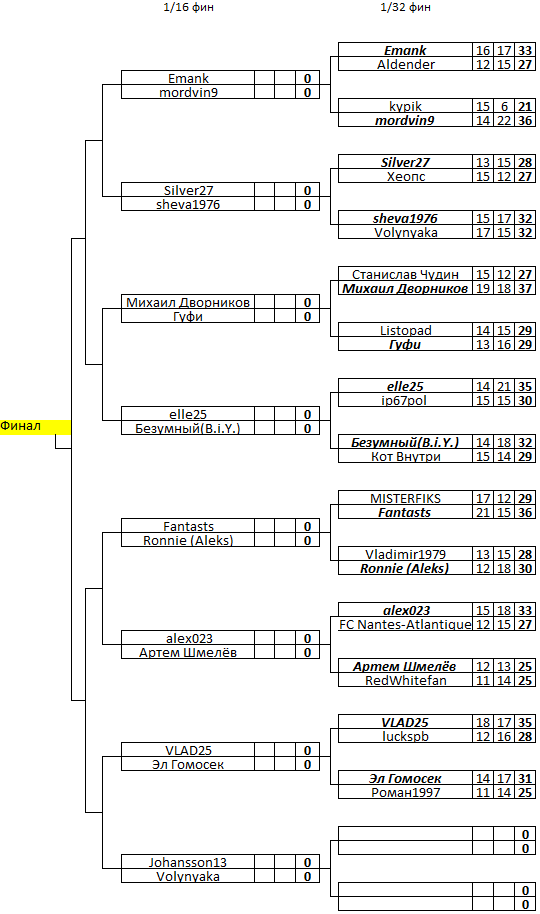 В матче Sheva1976-Volynyaka и после 2-х счетов у каждого вопрос не был решен. Помогли разницы - 2-х угаданных против ни одной у соперника, помогли Sheva1976 преодолеть планку 1/32 финала (однако в любом случае, как увидим ниже, проигравших в этой паре не оказалось и вовсе!).