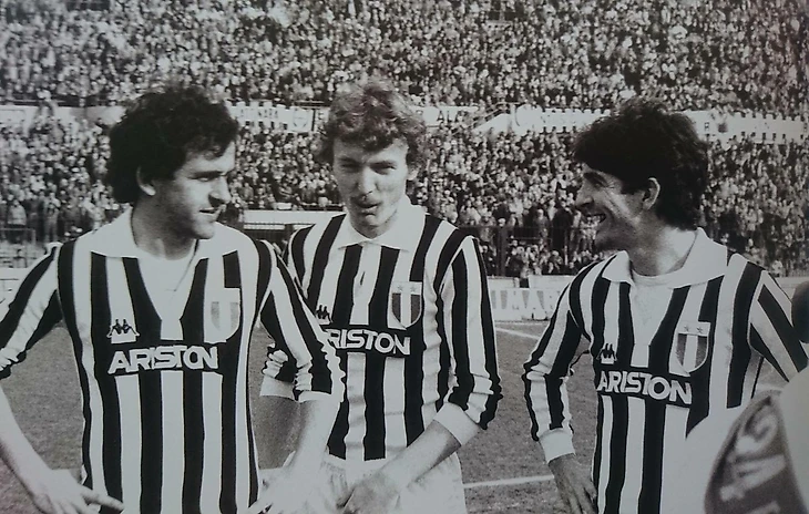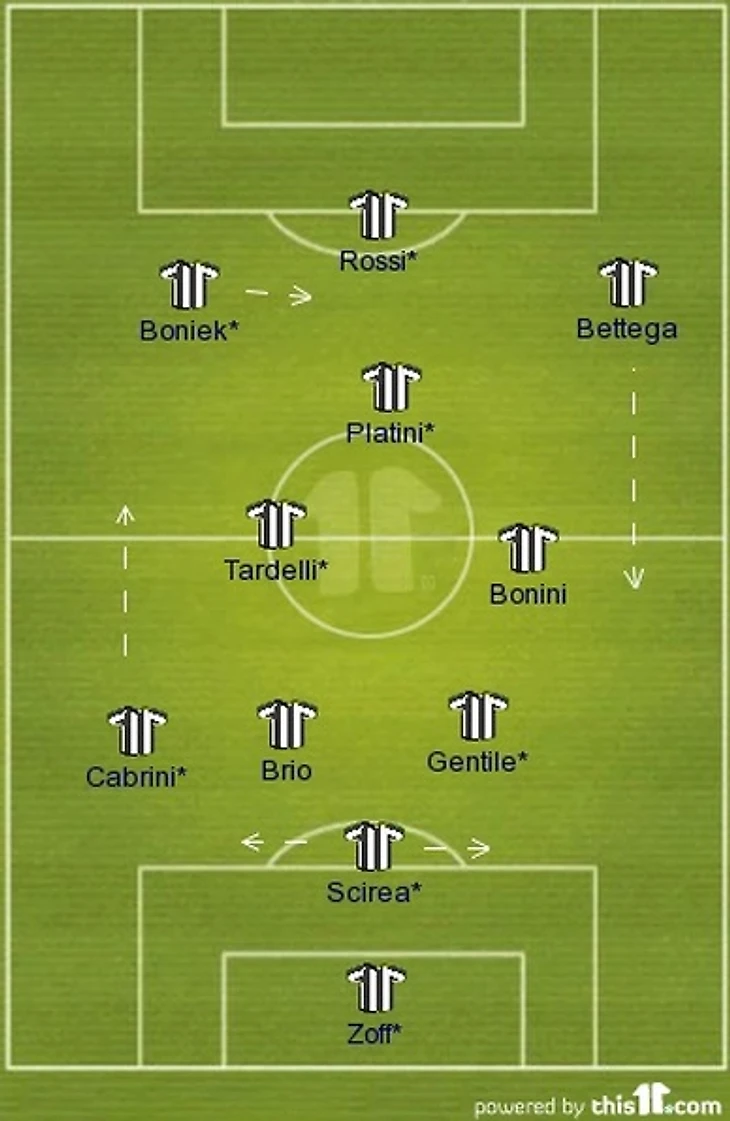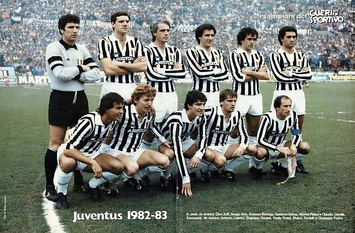 Серия А в сезоне 1982\83 была безусловно лучшей лигой мира. И в этой выставке талантов труппой номер один был мощный туринский Ювентус, базовая команда новоиспеченных чемпионов мира. Ах, что за команда по именам была! В воротах- капитан чемпионов мира, вечный папа Дзофф. Накануне нового сезона ему стукнуло уже 40 (!), но на испанских полях он сумел доказать, что у него все еще прекрасная реакция и нужная скорость, когда необходимо разбираться в критических ситуациях. В центре в защите- Гаэтано Ширеа, эталон либеро, отличавшийся особой мягкой манерой игры, сочетавшейся с природной грацией и фантастическим умением выбора позиции. На левом фланге обороны располагался Антонио Кабрини, один из лучших атакующих защитников своего времени (автор жизненно важного гола в ворота Аргентины и голевого навеса, с которого Росси открыл счет в игре с Бразилией). На противоположном фланге играл Темных дел мастер Клаудио Джентиле, во время встреч с которым самые блистательные художники своего времени (как Урибе, Марадона или Зико) терялись в своей тени. В центре поля (формально) обитал Марко Тарделли, внушавший страх как персональщик, при необходимости безбоязненно переступавший грани дозволенного, но в то же время вызывавший восхищение за организаторские способности в полузащите. Его неутомимое движение позволяло ему не только прикрывать ключевых игроков оппонента , но и активно участвовать в атакующей игре, связывая между собой атаку и оборону. На острие нападения- лучший футболист Мундиаля Паоло Росси, форвард с обостренным голевым чутьем и незаметной, какой-то деликатной манерой игры, умеющего в то же время безжалостно карать соперника за малейший промах. А был еще в атаке Беттега, без сомнения поехавший бы на Мундиаль, если бы не травма. Атлетически мощный, умеющий изобретательно вести борьбу в воздухе и обладавший таким ценным качеством как умением бороться в одиночку.