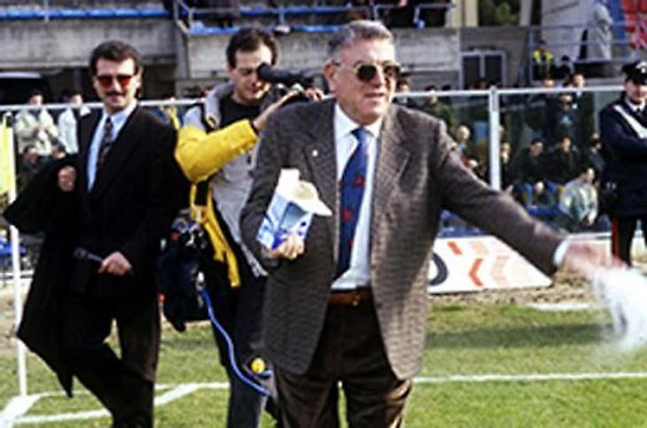 Легендарный ‘Il Presidentissimo’ Пизы Ромео Анконетани совершает свой знаменитый предматчевый ритуал, посыпая солью поле, на котором предстояло играть его команде