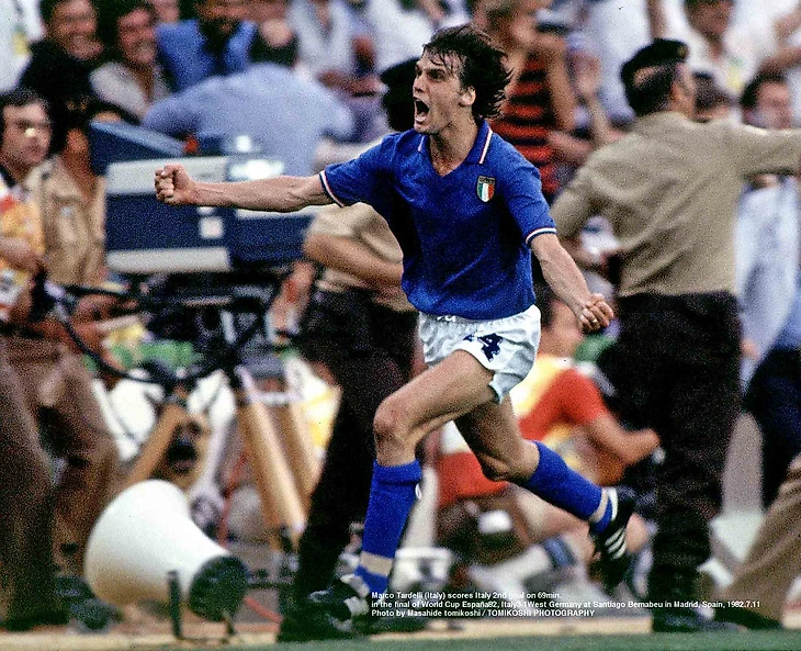 11 июля 1982, Мадрид, финал Мундиаля-82 Италия-ФРГ : Зло наказано!!! Только что второй мяч влетел в ворота Шумахера, ликует Марко Тарделли!