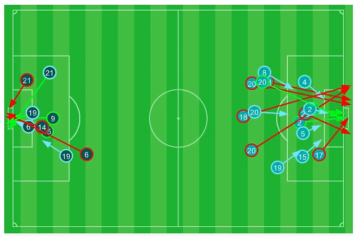 Второй тайм сборная Кипра провела активнее – больше били (11:3 по ударам), чуть больше владели мячом (51% времени), а команда Карпина оборонялась в низком блоке. Правда, в нужные моменты игру от ворот отодвигали. Но итоговая картина ударов все равно выглядит не очень (удары киприотов – справа).