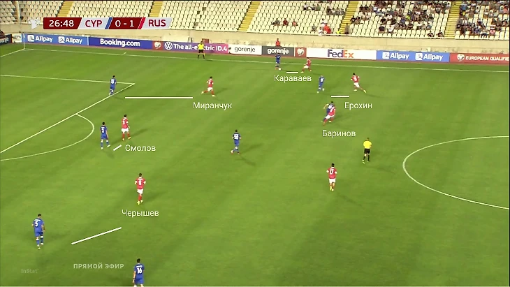 5. Под схему с тремя центральными защитниками Валерий Карпин изменил прессинг. Черышев – Смолов – Миранчук опекали центральных защитников, при переводе на фланг Головин или Ерохин встречали крайних защитников (изредка туда вбегал Караваев), а Баринов забирал к себе полузащитника, который был ближе всего к мячу.