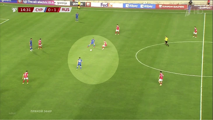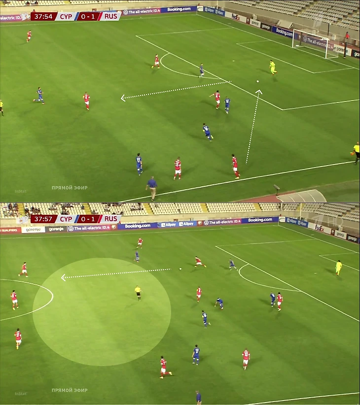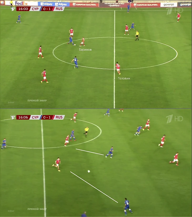 Конкретный пример: прессинг Баринова, где он остался 1-в-2 – Кипр получил свободную зону, но из-за долгого решения атака затормозилась.