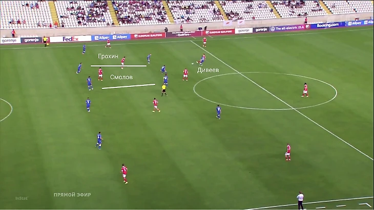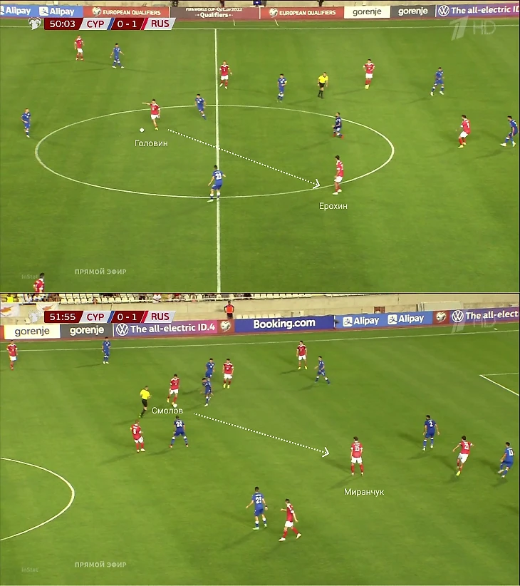 Была и другая деталь – у Кипра были большие расстояния между линиями. Туда врывался Смолов – и Россия закреплялась на чужой половине поля. Так получился первый гол: Федор отскочил в глубину, а затем создал момент для Ерохина.