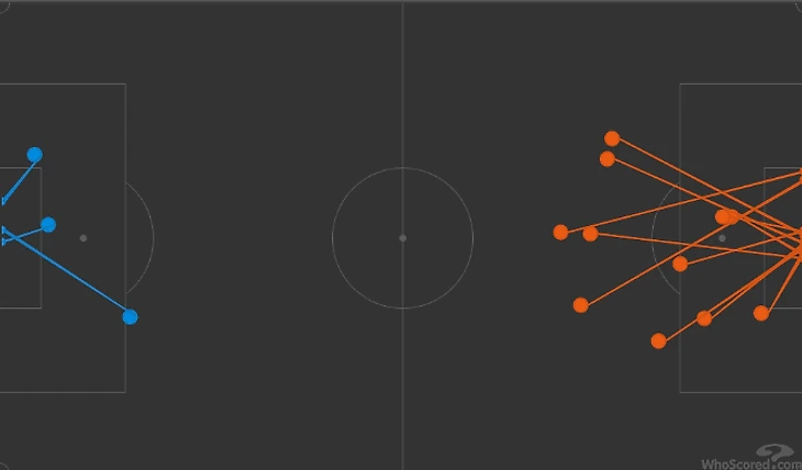 В остальном все было спокойно – Кипр давил, Россия доигрывала. Хозяева нанесли 11 ударов во втором тайме (ниже – карта ударов), половина из них – из-за штрафной, пять – из штрафной (три – заблокировано), один – неопасный удар головой мимо ворот, еще один – вышеупомянутый удар Лоизу.