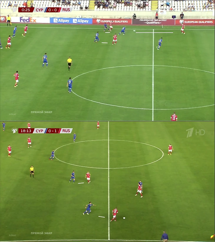Вертикализация быстро принесла результат. Когда мяч был у Дивеева и Джикии, четверка полузащитников Кипра вставала в линию. Это ее растягивало – между игроками появлялись зазоры.