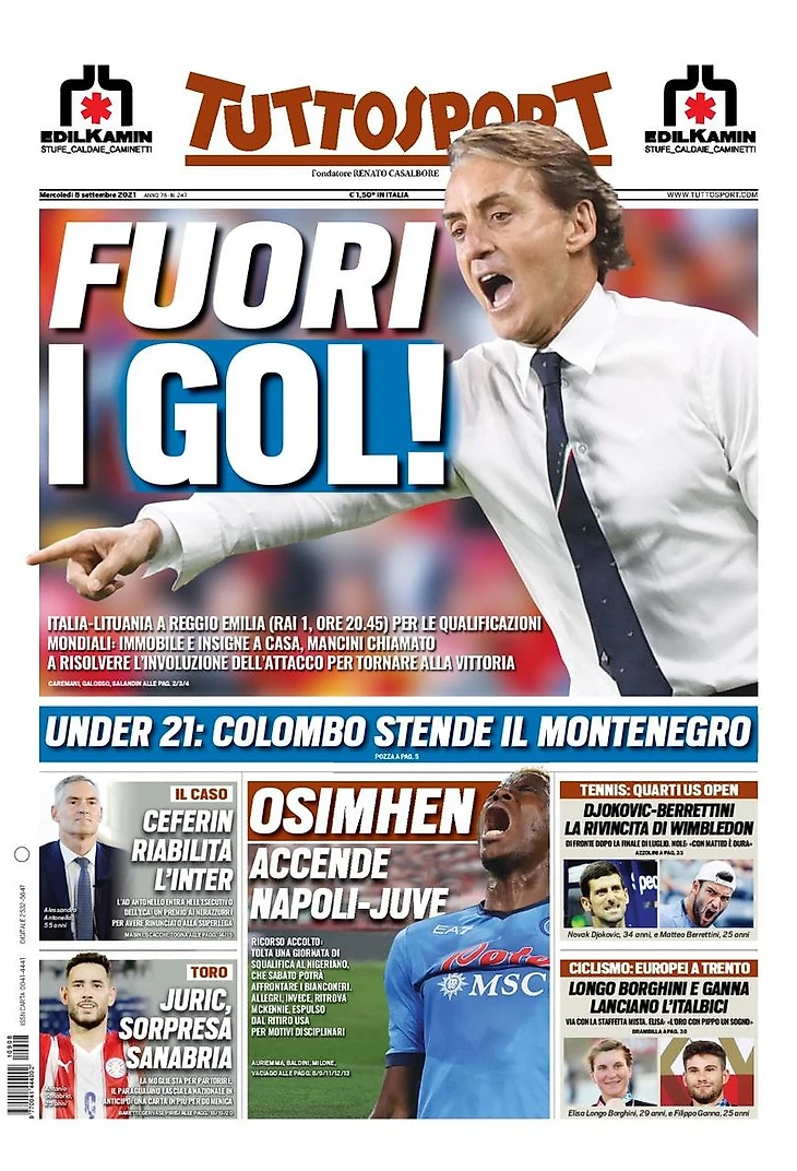 Сегодняшний матч Италии с Литвой, скорое возобновление чемпионата, а также принятие апелляции «Наполи» по Осимхену – в утреннем обзоре заголовков итальянских спортивных изданий в блоге «В гостях у Кальчо».