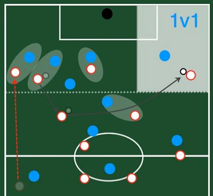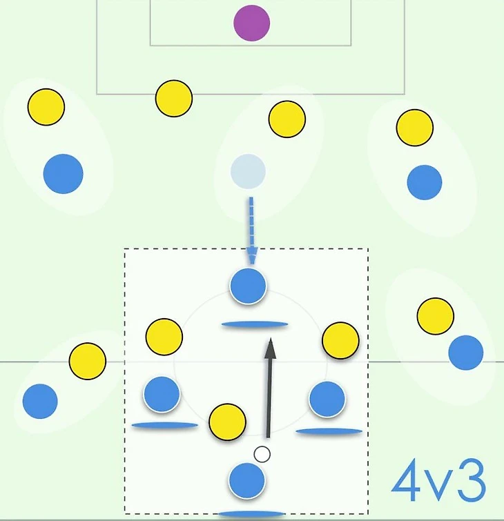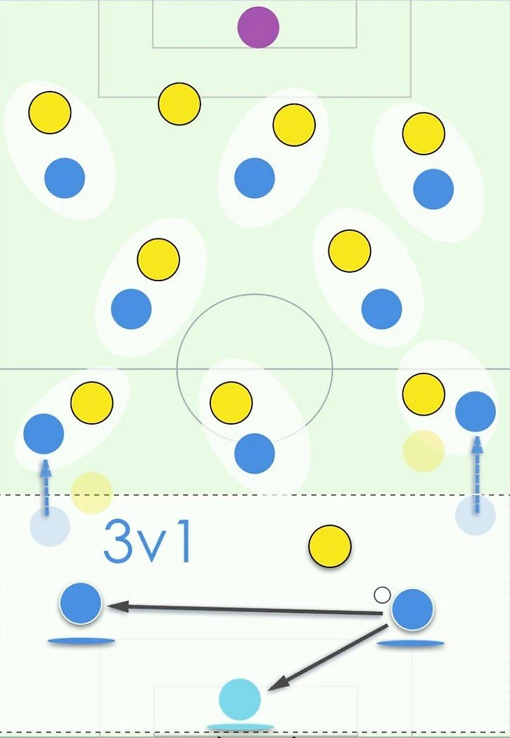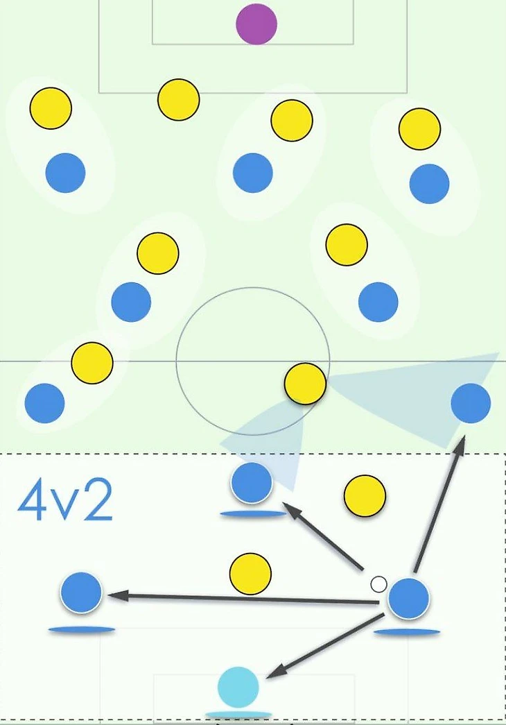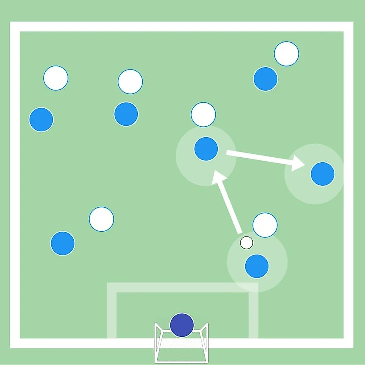 Очень распространенный пример движений - это движение, когда латерали продвигаются к зоне полузащиты, чтобы не дать прессинговать сопернику, позволяя продолжить игру 3v1 в первой трети, но теперь с более широким расположением и гораздо большей вероятностью продвижения.