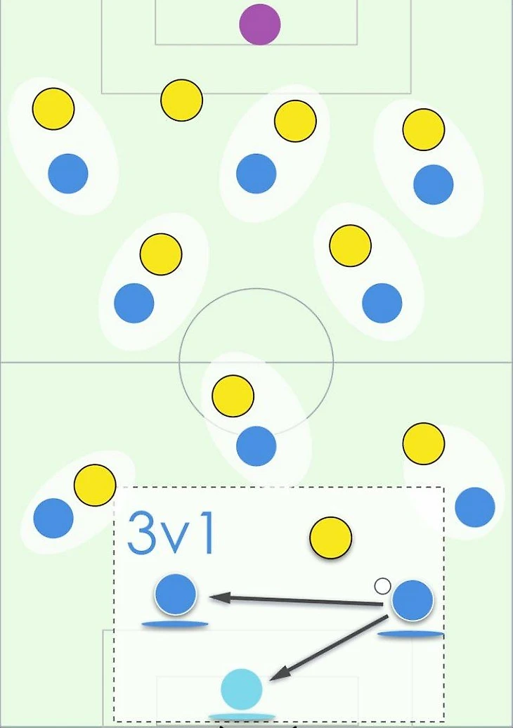 Первоначальный расклад из двух команд, играющих по схеме 4-3-3. Этот базовый исходный макет уже представляет ситуацию 3v1 в стартовой зоне