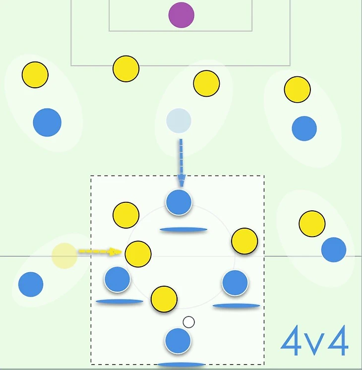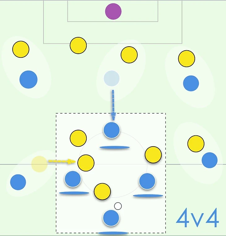 Например, особая ситуация в игре 4 на 4 - это когда один из нападающих (хотя он также может быть центральным защитником) решает войти в эту зону, чтобы нейтрализовать свободного игрока. Быстрые движения по снятию опеки и постоянная поддержка являются ключом к продолжению продвижения (в дополнение к попыткам добиться превосходства со стороны игроком, которые находятся в другой зоне).
