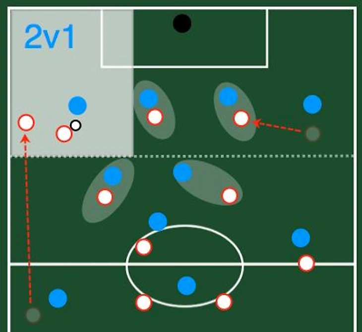 Создание 2v1 в финальных зонах часто является очень желательным контекстом для поиска, но этого не так легко достичь. Однако это не должно указывать на то, что некоторые игроки не пытаются его создать постоянно. В этом случае раскрыться пытается левый защитник.