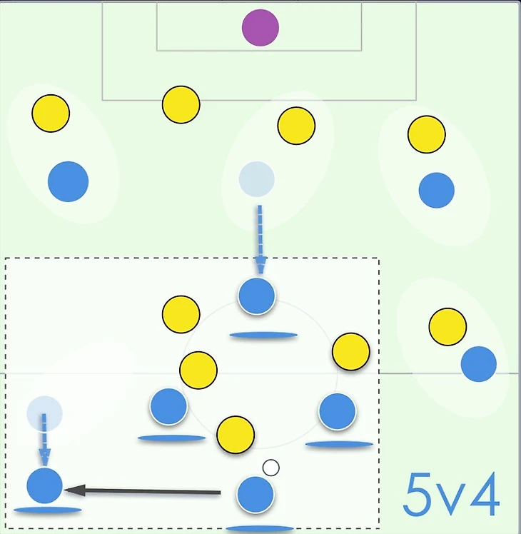 В зоне завершения очень сложно добиться численного превосходства (фактически, во многих случаях будет численное превосходство у обороняющейся команды), за исключением переходных эпизодов. Возможные ситуации: попытка сыграть 1v1 или даже 2v1, и надежда на постоянное творчество игроков во многих случаях является оскорбительным принципом. Кроме того, еще одна фундаментальная концепция - как справиться с потерей мяча в этих областях, - жизненно важный момент, который не всегда принимается во внимание.