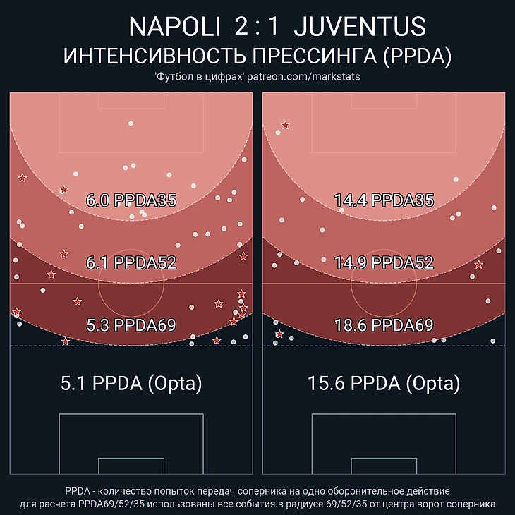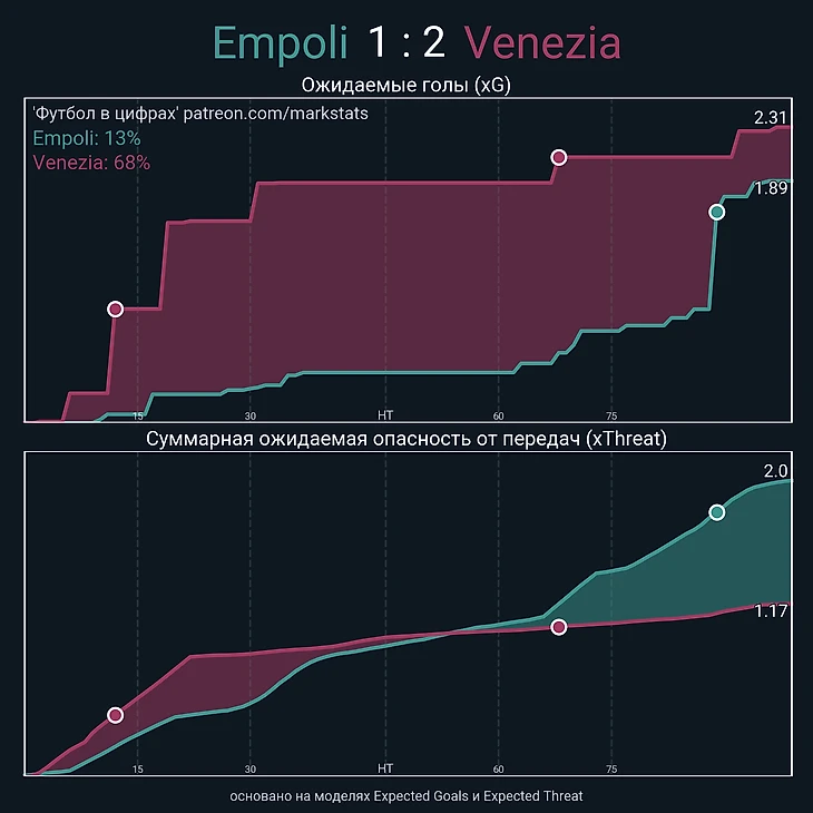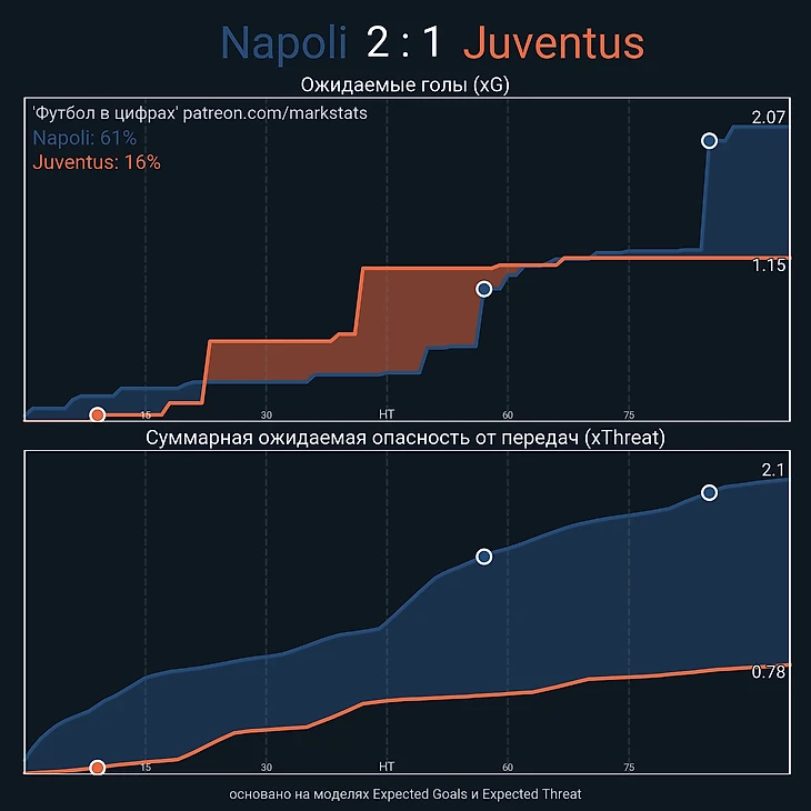 В 2 матчах Эмполи из 3 играл ТБ 2,5 В 2 матчах Венеции из 3 играл ТБ 2,5 Наполи 2:1 Ювентус ▪ Вероятность победы: 61.23% - 15.53% ▪ Явные голевые моменты (opta): 2 - 3 ▪ Наклон поля (field tilt): 78% - 22% ▪ PPDA (Opta): 5.1 - 15.6 ▪ Deep completions: 11 - 2
