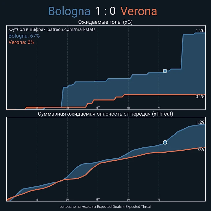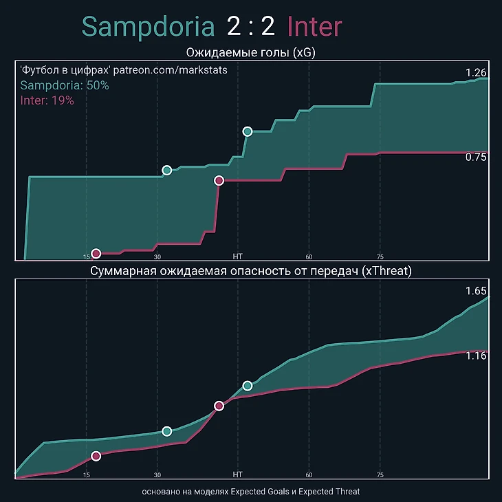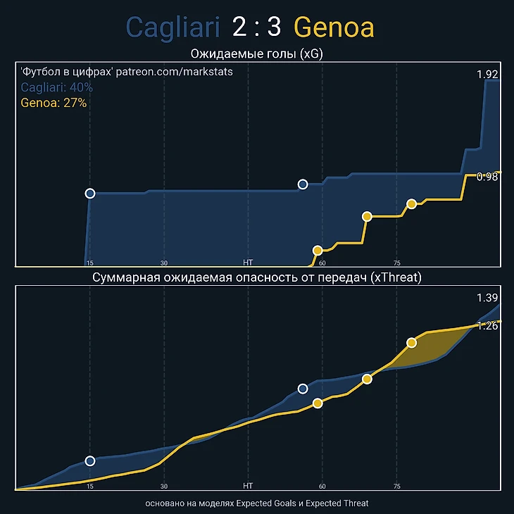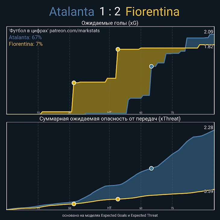 ▪ Вероятность победы: 40.43% - 27.12% ▪ Явные голевые моменты (opta): 2 - 3 ▪ Deep completions: 6 - 6 ▪ Наклон поля (field tilt): 39% - 61% ▪ PPDA (Opta): 11.7 - 10.2