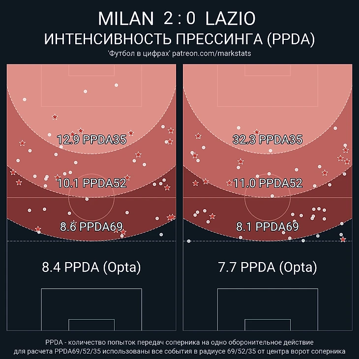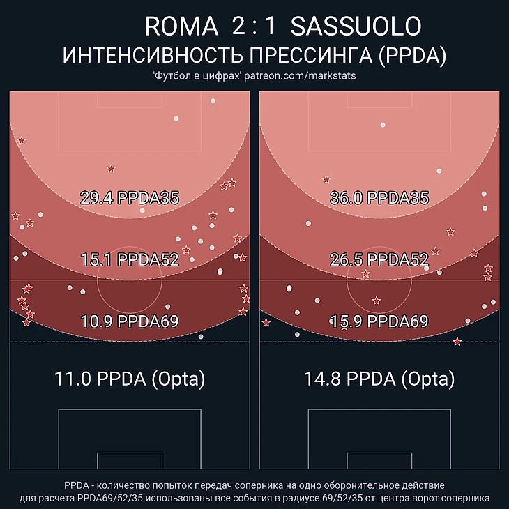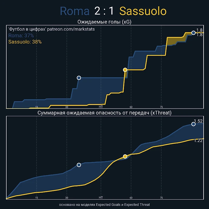 Милан не пропустил в 2 матчах из 3 ( в сезоне 18/19 34.2% матчей 13/38; 19/20 31.5% матчей 12/38; 20/21 36.8% матчей 14/38) В 2 матчах Лацио из 3 играл ИТБ 2,5 ( в сезоне 18/19 15.7% матчей 6/38; 19/20 28.9% матчей 11/38; 20/21 18.4% матчей 7/38) Рома 2:1 Cассуоло ▪ Вероятность победы: 37.39% - 37.78% ▪ Явные голевые моменты (opta): 3 - 4 ▪ Deep completions: 8 - 8 ▪ Наклон поля (field tilt): 56% - 44% ▪ PPDA (Opta): 11.0 - 14.8