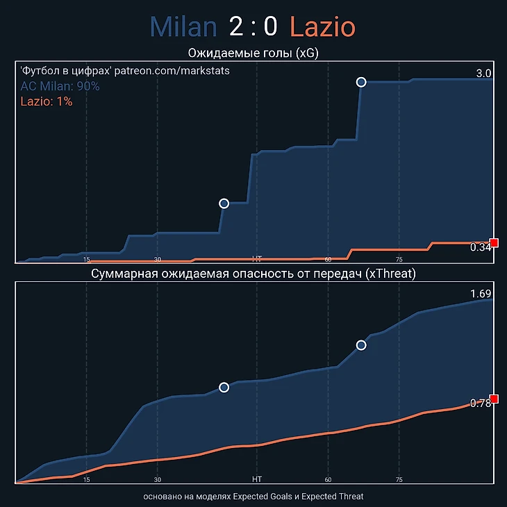 ▪ Вероятность победы: 90.07% - 1.32% ▪ Явные голевые моменты (opta): 5 - 0 ▪ Deep completions: 11 - 0 ▪ Наклон поля (field tilt): 59% - 41% ▪ PPDA (Opta): 8.4 - 7.7