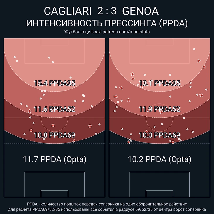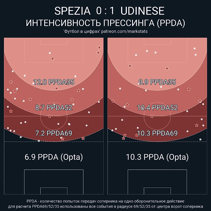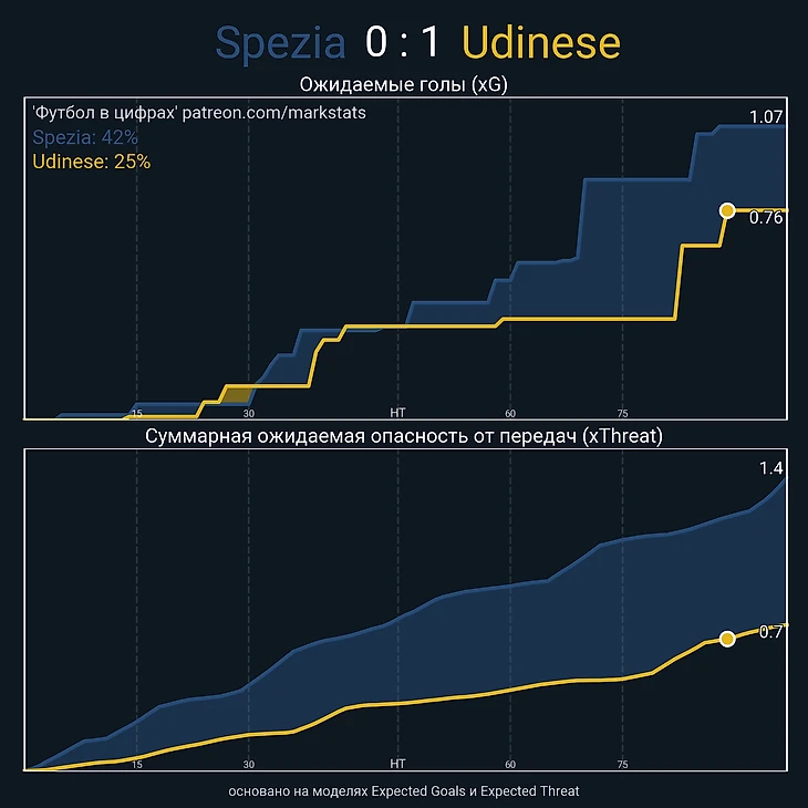 В 3 матчах Кальяри из 3 играл ТБ 2,5 ( в сезоне 18/19 36.8% матчей 14/38; 19/20 78.9% матчей 30/38; 20/21 52.6% матчей 20/38) В 2 гостевых матчах Дженоа из 2 играл ТБ 3,5 ( в сезоне 18/19 21% матчей 4/19; 19/20 52.6% матчей 10/19; 20/21 15.7% матчей 3/19) Cпеция 0:1 Удинезе ▪ Вероятность победы: 42.12% - 24.51% ▪ Явные голевые моменты (opta): 0 - 1 ▪ Deep completions: 11 - 3 ▪ Наклон поля (field tilt): 62% - 38% ▪ PPDA (Opta): 6.9 - 10.3