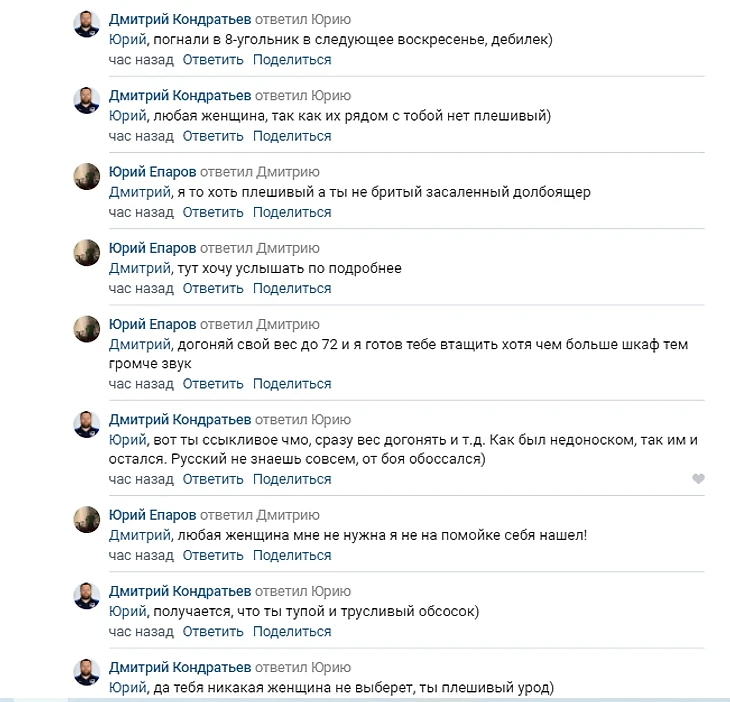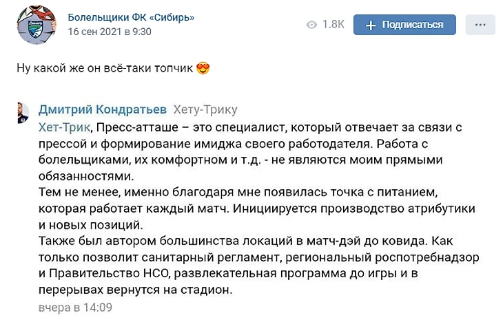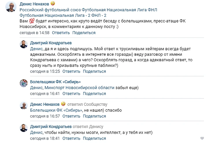 В третьем дивизионе России тоже кипят страсти – в субботу живо было в группе болельщиков «Сибири» во «ВКонтакте», где после банкротства старого клуба обсуждают новости созданного в 2019-м «Новосибирска». Еще в четверг в паблике появился пост про пресс-атташе клуба Дмитрия Кондратьева, но все веселье началось на выходных, когда до него добрался сам герой публикации. Вот тот самый пост, который спровоцировал ветку с сотнями комментариев.