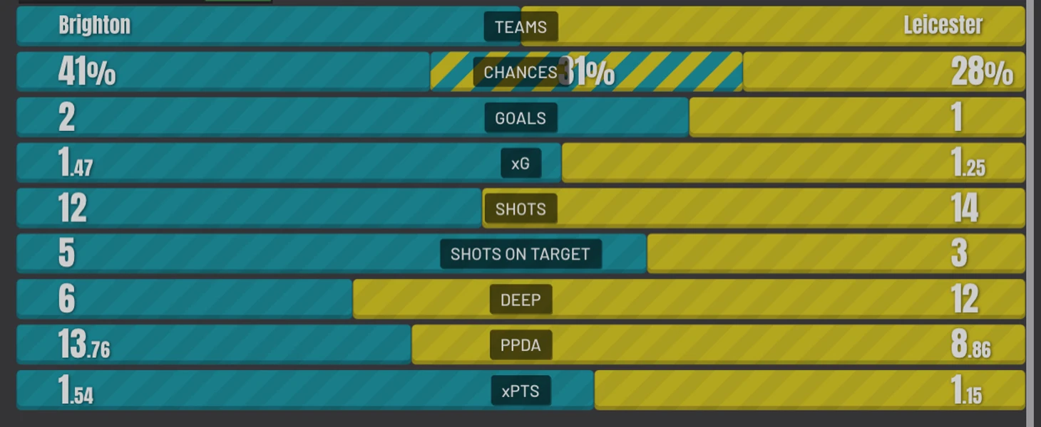Ещё «Чайки» превзошли «Лис» по ударам в створ, но хуже прессинговали (показатель PPDA). Отмечу, что «Лестер» гораздо больше владел мячом (62% на 38%). Также «Брайтон» превзошел оппонента по отборам, успешным обводкам, выигранной в воздухе борьбе и меньше терял мяч.