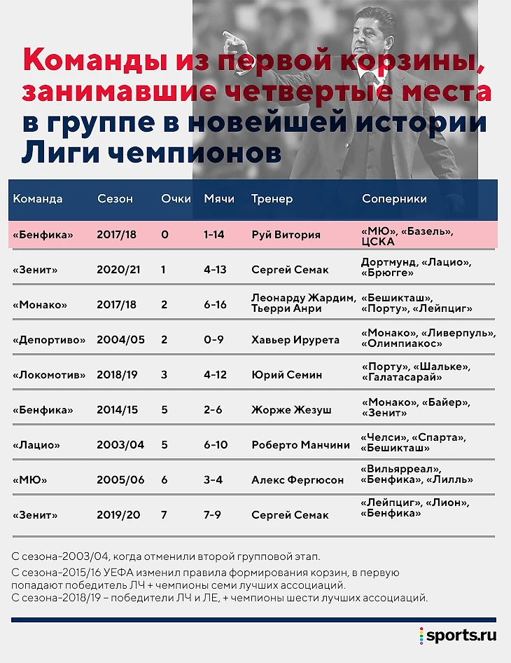 В Лигу чемпионов-2017/18 «Бенфика» Руя Витории вышла из первой корзины – как чемпион Португалии. И попала в одну группу с «Манчестер Юнайтед» (победителем Лиги Европы), «Базелем» и ЦСКА, одержавшим за четыре предыдущих розыгрыша ЛЧ всего 3 победы и стабильно занимавшим последнее место в группе.