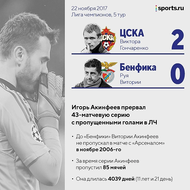 Но вместо большого камбэка «Бенфики» случилось знаковое для российского футбола события – Игорь Акинфеев не пропустил в Лиге чемпионов. Да-да, именно тогда, в ноябре 2017-го вратарь ЦСКА закончил .