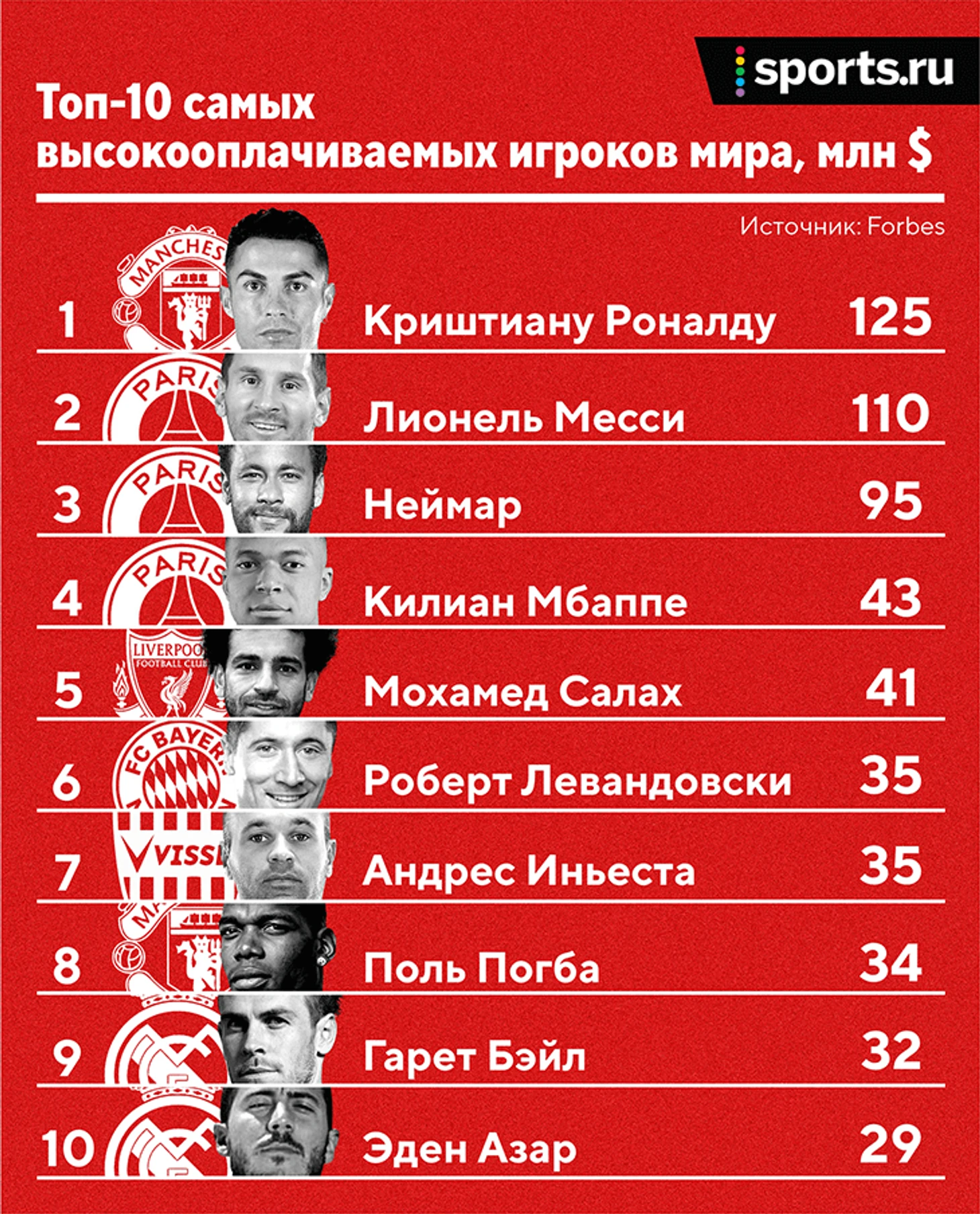 В Forbes заверяют, что при составлении топа общались с клубами, агентами, брендами и футбольными экспертами. Давайте изучим, как накопились такие гигантские суммы.
