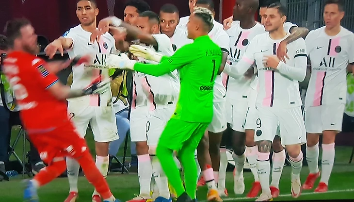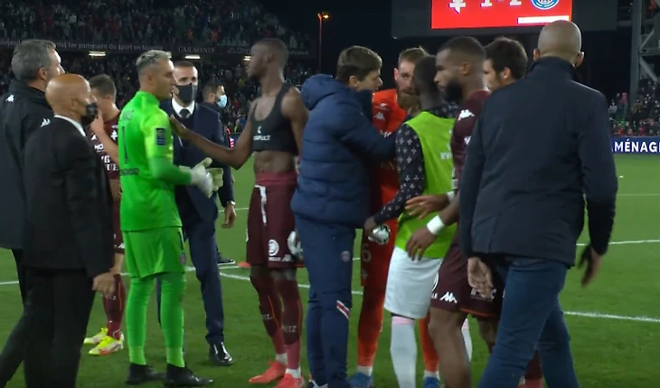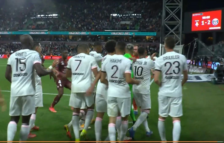 Когда довольный Париж обнимался возле гостевого сектора – к ним подбежал кипер «Метца» Александр Укиджа и попытался напасть на Килиана Мбаппе. Партнеры кое-как отбили своего форварда