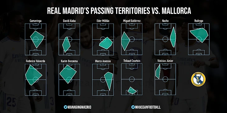 Мадрид выходил играть по схеме 4-2-3-1, где в опорной зоне располагались Камавинга и Феде Вальверде. Но минуты с 25, когда бланкос тотально завладели мячом, эта схема превратилась скорее в классические для Мадрид 4-3-3. Мадрид владел мячом, поэтому два опорника были не нужны и Вальверде играл чуть выше.