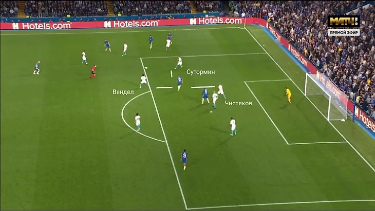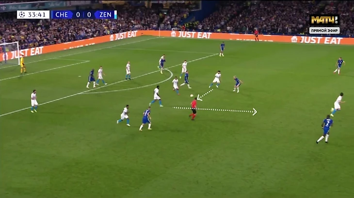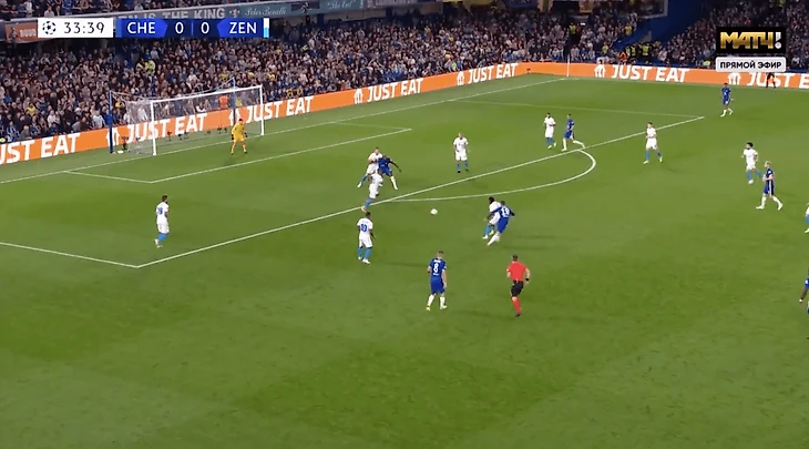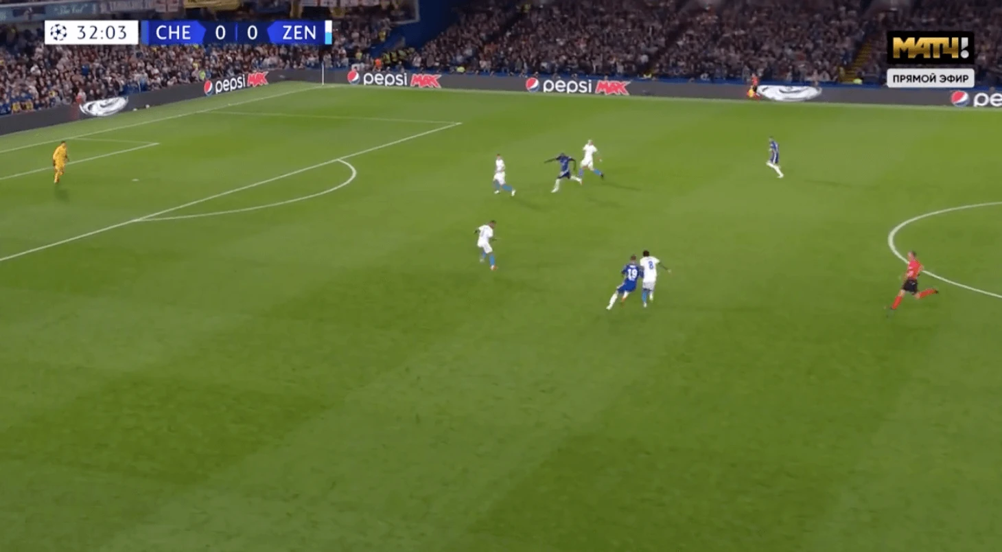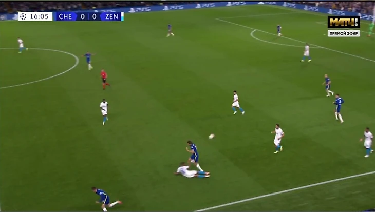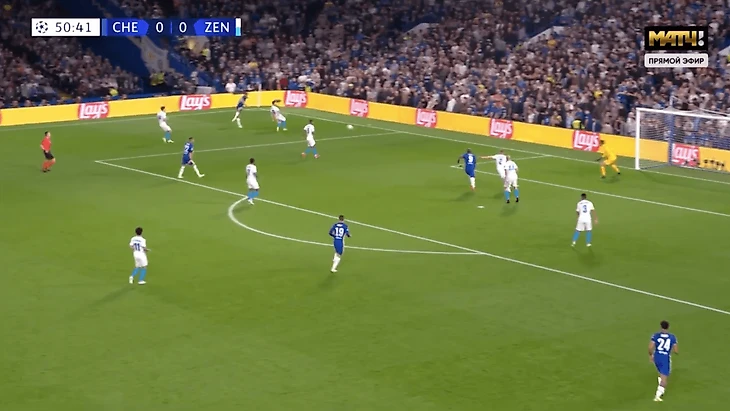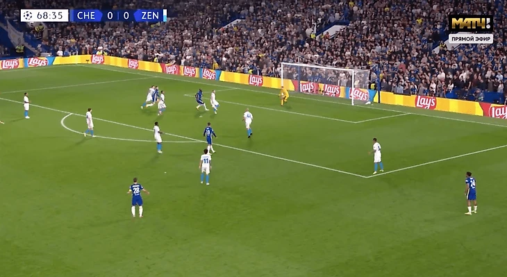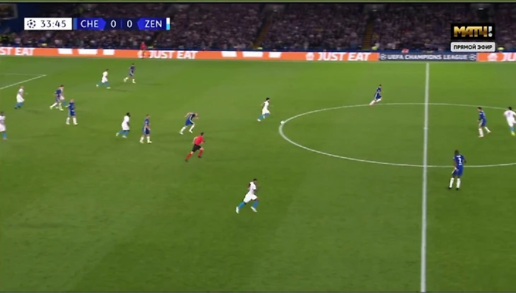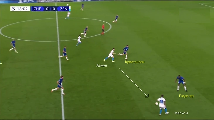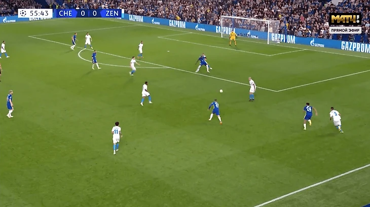 Команда Сергея Семака первые 10 минут второго тайма старалась очень высоко прессинговать, когда лондонцы разыгрывали мяч от ворот. Ковачич и Жоржиньо отходили к своим воротам, вынуждая Вендела и Кузяева подниматься за ними, оставляя за спиной множество пространства, которое с радостью использовали англичане. В один из подобных моментов у Рюдигера было столько пространства, что немец смог дойти до штрафной площади «Зенита» и пробить, однако мяч прошёл рядом со штангой