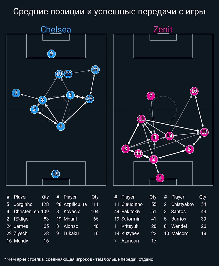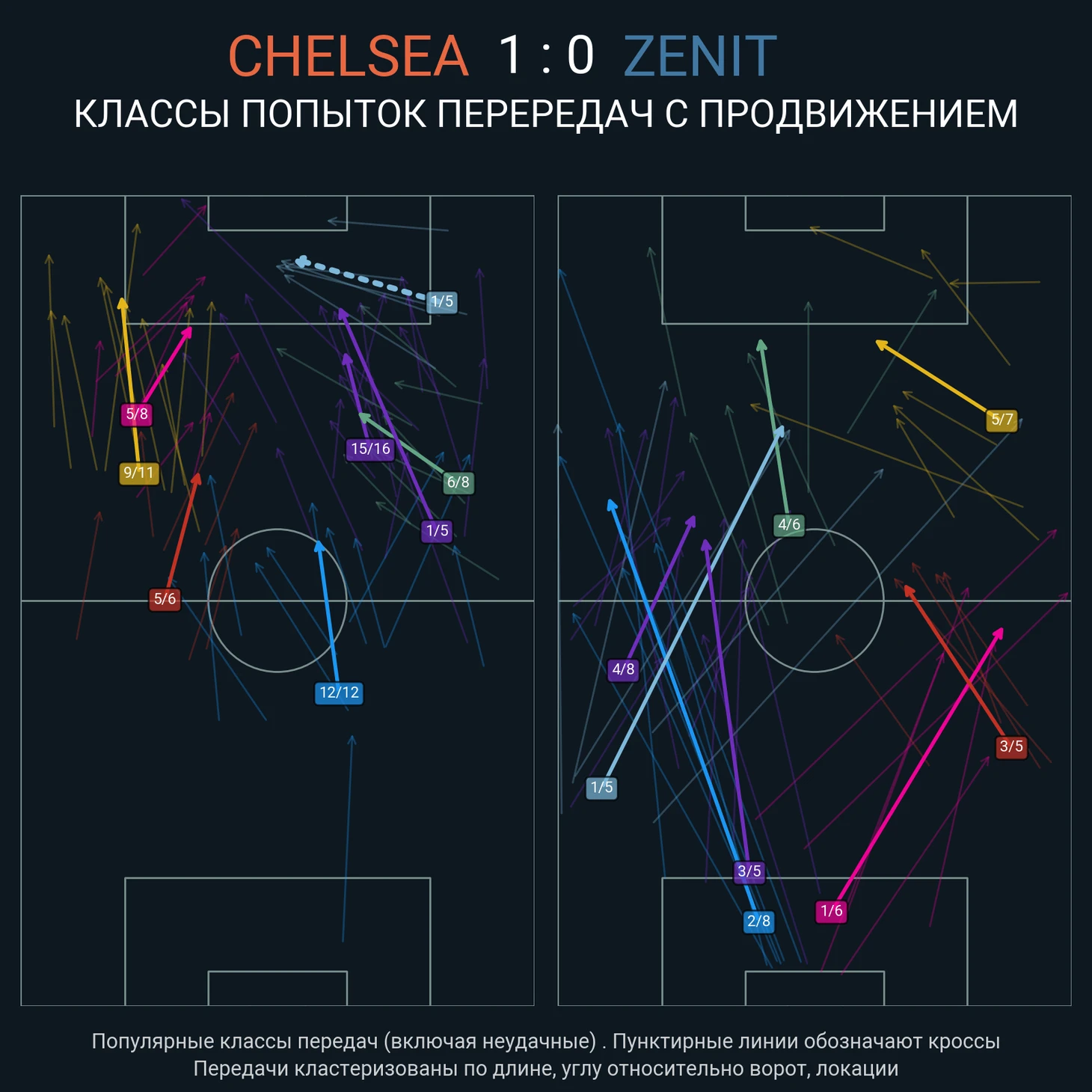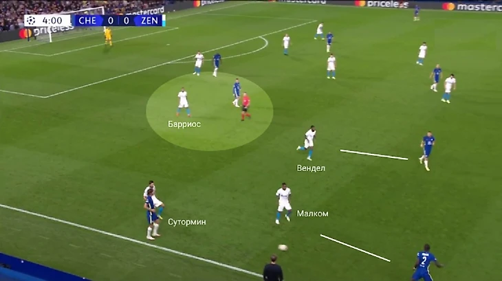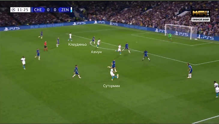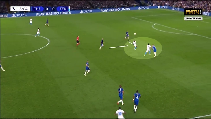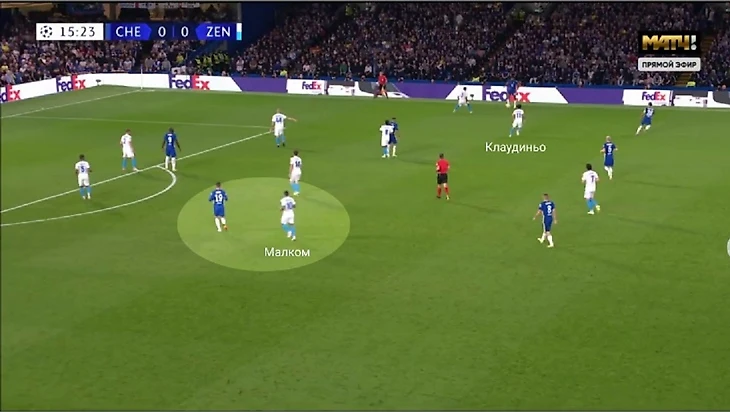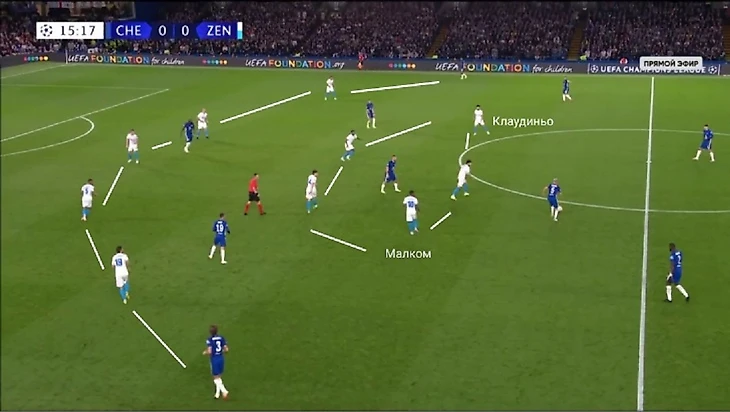 Обычно «Челси» взламывает прессинг в средней фазе атаки за счёт смещений Маунта и/или Зиеша. «Зенит» прекрасно поникал опасность «десяток» соперника, поэтому, когда они опускались в глубину для получения мяча, за ними опускались Вендел и Кузяев. Если же опорники питерцев опекали других игроков, за Маунтом и/или Зиешом следовали крайние центральные защитники. Также закрывать плеймейкеров «Челси» помогали Клаудиньо и Малком. Благодаря узким позициям они во время фланговых атак стягивались в центр, и помогали с подключениями Маунта и/или Зиеша. Особенно важным в этом плане был Клаудиньо. По покрытой дистанции и количеству перестроений новичок команды – лидер с серьёзным отрывом, именно поэтому Сергей Семак заменил его так поздно.