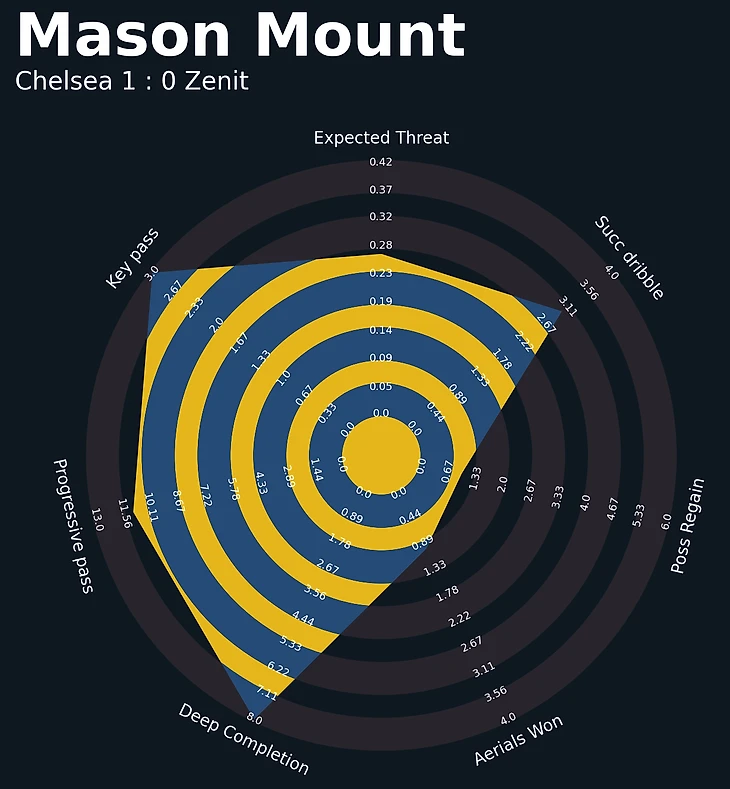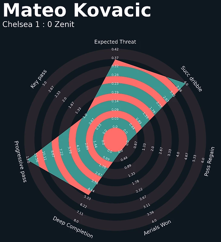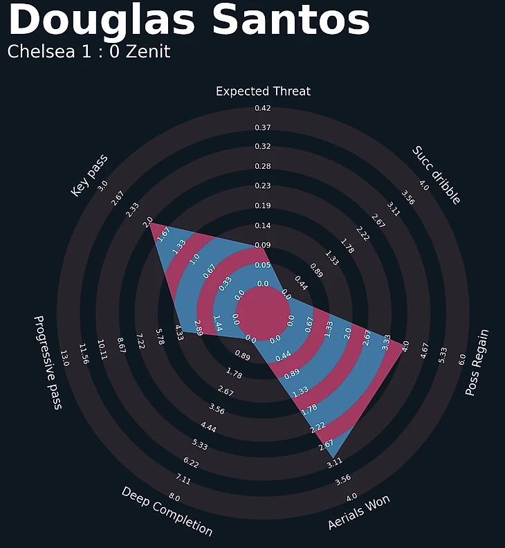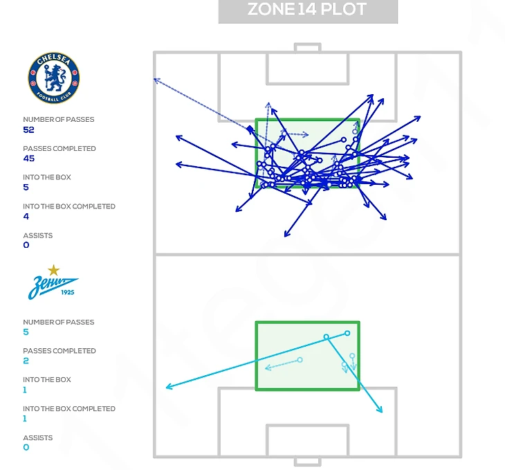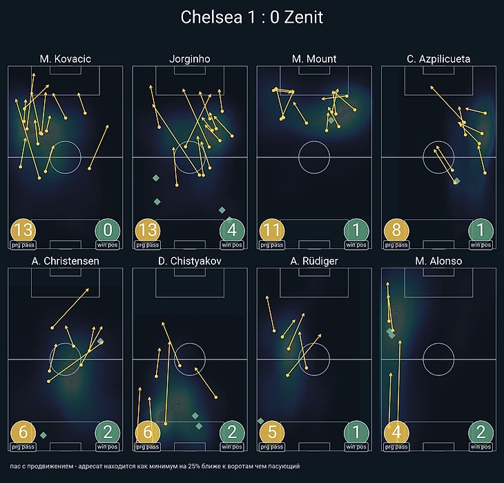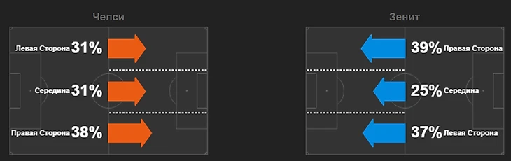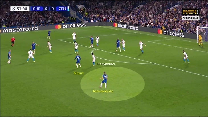 Обычно «Челси» взламывает прессинг в средней фазе атаки за счёт смещений Маунта и/или Зиеша. «Зенит» прекрасно поникал опасность «десяток» соперника, поэтому, когда они опускались в глубину для получения мяча, за ними опускались Вендел и Кузяев. Если же опорники питерцев опекали других игроков, за Маунтом и/или Зиешом следовали крайние центральные защитники. Также закрывать плеймейкеров «Челси» помогали Клаудиньо и Малком. Благодаря узким позициям они во время фланговых атак стягивались в центр, и помогали с подключениями Маунта и/или Зиеша. Особенно важным в этом плане был Клаудиньо. По покрытой дистанции и количеству перестроений новичок команды – лидер с серьёзным отрывом, именно поэтому Сергей Семак заменил его так поздно.
