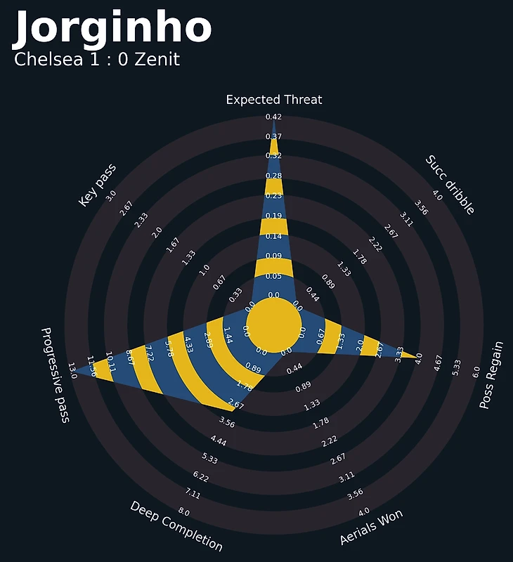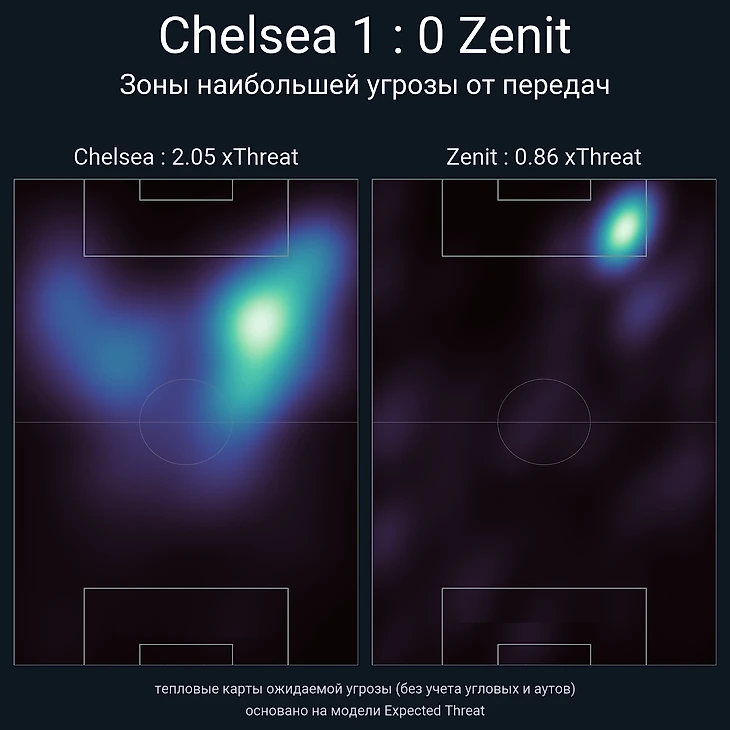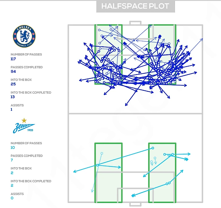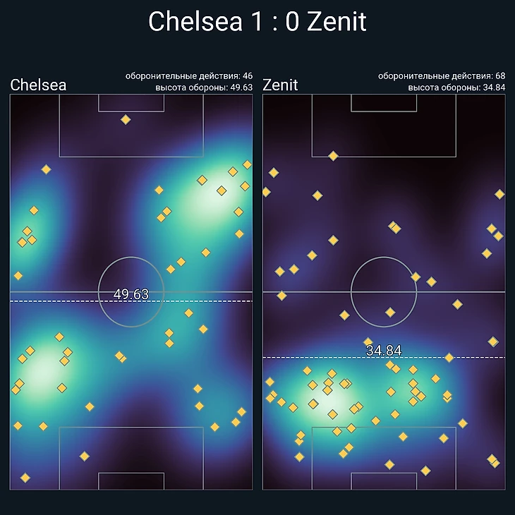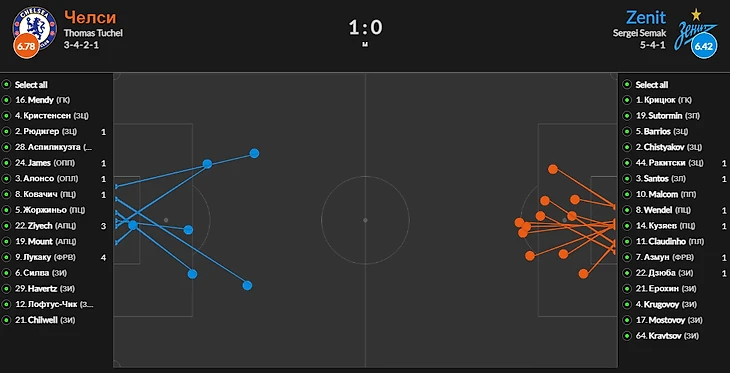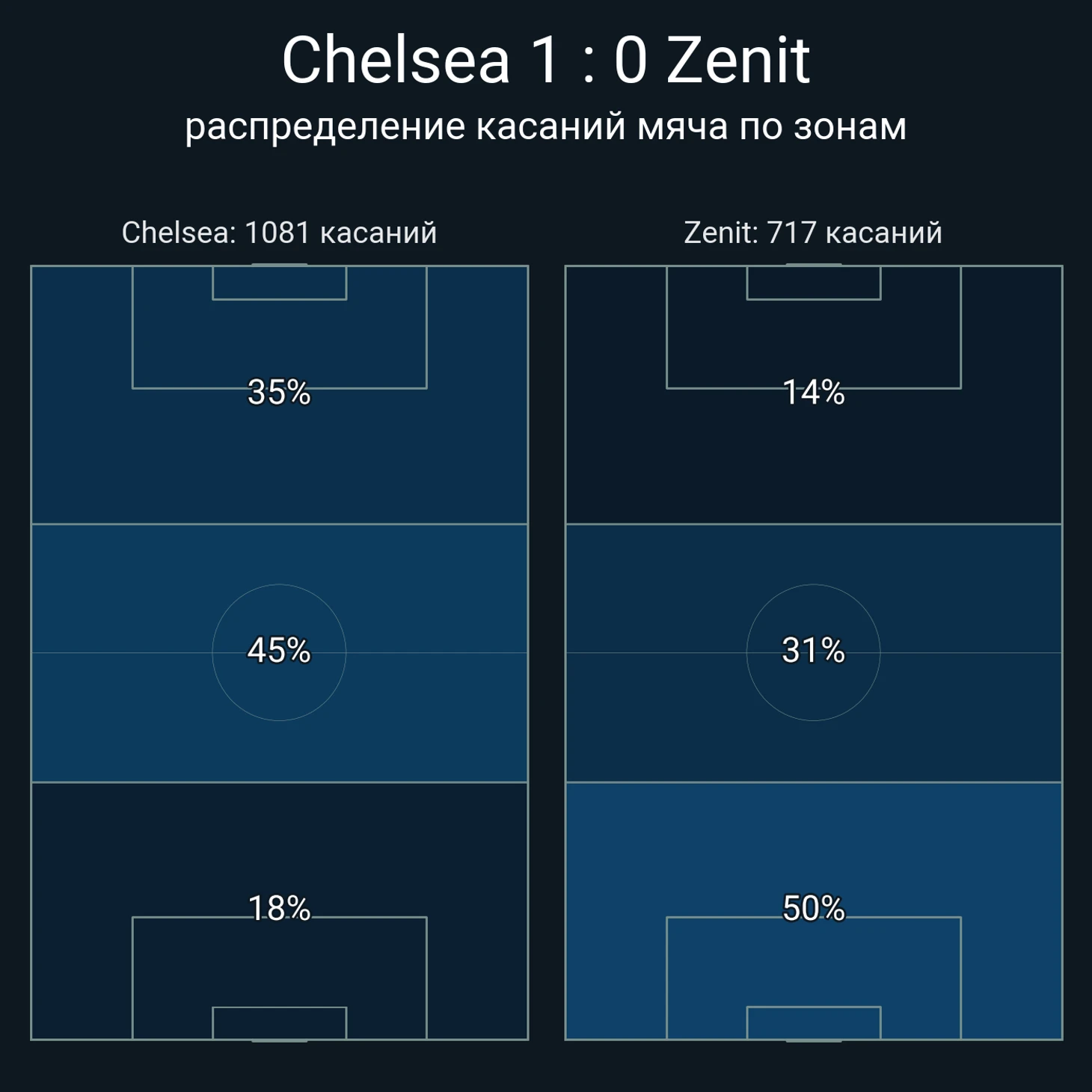 В этом матче «Челси» продемонстрировал свою способность вносить хаос в оборонительные редуту соперника. «Зенит» же, в свою очередь, продемонстрировал, то, как этот хаос можно усмирить. На смену полуфлангов между Зиешом и Маунтом, российская команда ответила тотальным контролем и потрясающими перехватами мяча со стороны Барриоса и Ракицкого. Джеймс и Алонсо могли подниматься вперёд, чтобы насыщать зоны на случай заброса в сторону Лукаку. Вот только мобильные Малком и Клаудиньо помогали в игре без мяча своим вингбекам, благодаря чему ни Джеймс, ни Алонсо не имели ситуаций 1 в 1 на фланге. Главный конструктор всех атак лондонцев – Жоржиньо имел относительную свободу в центре, однако из-за компактности среднего блока противника, чемпиона Европы вынуждали разыгрывать мяч средними или длинными передачами.
