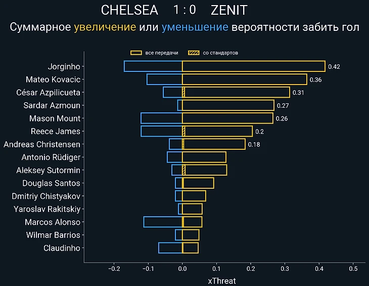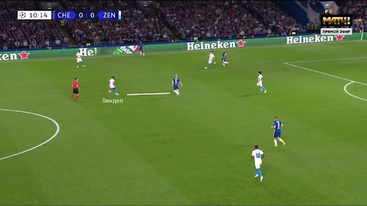 Правда, для выхода из обороны «Челси» использует не только опорников, но и крайних центральных защитников, и вингбеков. Если с Рисом Джеймсов и Маркосом Алонсо справляться удавалось, то с Сесаром Аспиликуэтой и Антонио Рюдигером - не всегда. Когда они получали и двигали мяч вперёд, на них выдвигался ближайший вингер «Зенита», и тогда Венделу приходилось подниматься из опорной зоны, чтобы перекрыть Жоржиньо и Ковачича, оставляя зону за спиной. Этим же и вызвана столь агрессивная игра на выходах крайних центральных защитников. Вместе с Дугласом Сантосом они совершили 10 перехватов. Также сказывалось осознание того, что за спиной Лукаку всегда остаётся Чистяков.