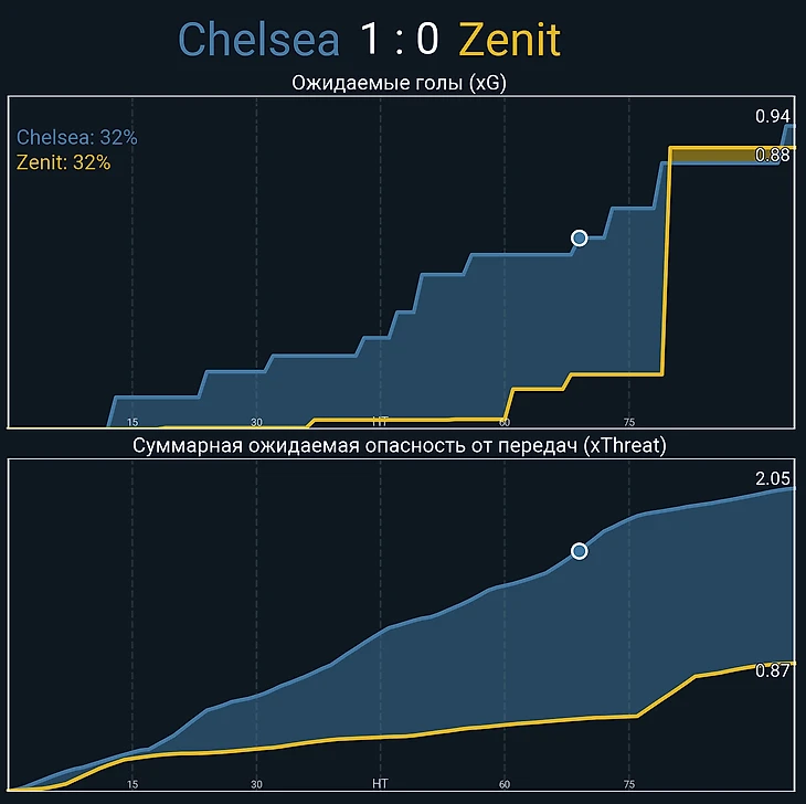 После этого момента Тухель выпустил сразу двух свежих защитников – Чилуэлла и Силву, чем окончательно убил шансы «Зенита» отыграться. Следующее касание российской команды в чужой опорной зоне произойдёт лишь на 86 минуте после неудачной скидки от Дзюбы.